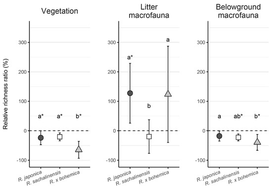 Relative taxonomic richness ratio (%) according to invader species. RRR that differ statistically from zero (Mann-Whitney test, = 0.05) are marked with an asterisk. Within each of the three compartments, differences between the knotweed species are labelled with the group-letters from a Kruskal-Wallis test ( = 0.05).