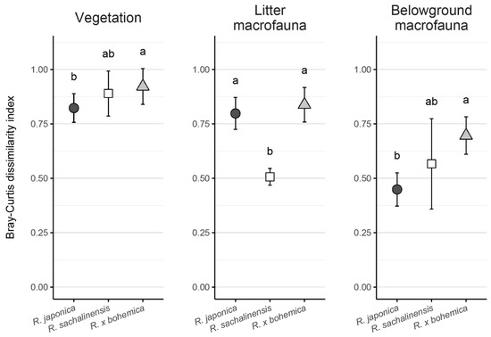 Bray-Curtis dissimilarity index of invaded communities compared to the native communities. Within each of the three compartments, differences between the Reynoutria species are labelled with the group-letters from a Kruskal-Wallis test ( = 0.05).
