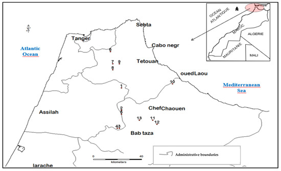 The surveys took place in 13 traditional vineyards (Figure 1), located in the region of Tanger Tétouane Al-Hoceima. This is the northwest section of the Rif arc, which many authors refer to as “Jbala country”. Due to the energetic aspect of its relief, this ensemble is characterized as much by the originality of its environment (mountain, Mediterranean and Atlantic) as by the specificity of its role in both the ancient and contemporary history of the Kingdom. In this region, there are mainly four homogeneous zones: the Tangérois; the coast and the Mediterranean basins; the Bas Loukkos basin; and the Jbala, containing the sampling sites [8].