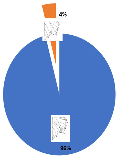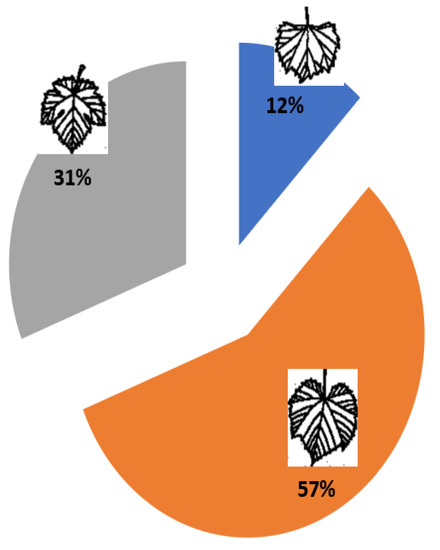 According to OIV 067, we distinguished between five groups of grape varieties (Figure 2); grape varieties with a pentagonal shape made up a proportion of 83%, while 8% had a wedge shape, 6% had a circular leaf, and only 1% had heart-shaped leaves.