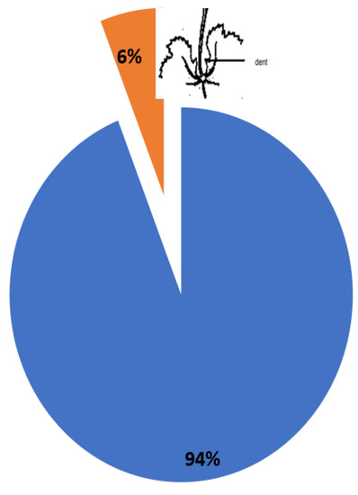Regarding OIV 081 1, it was noted that 94% of the grape varieties studied were characterized by the absence of teeth in the petiolar sinus, against 6% which had the particularity of the presence of teeth (Figure 7).