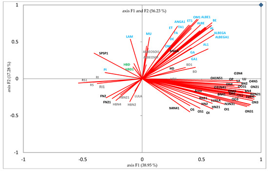 Most of the variance expressed by axis F1 is explained by the correlation with the variables related to the following distances: leaf width (LA), leaf length (LU), length of veins and ribs (N1, N2, N3, N4 and N5), distance between vein tips (N2-N21, N3-N31 and N4-N41), leaf length including petiole (LUPIC), surface (Area), and petiole length (OP). As for axis F2, it is correlated with the variables related to the following angles: angle between I and I ‘(MU), angle between S and S1 (LAM), angle between N2 and N2’ (DE), angle between N1 and N2 (OM), angle between N2 and N3 (ET), angle between N3 and N4 (TA), the sum of the angles AL + BE (ALBE), and the sum of the angles AL1 and BE1 (ALBE1). This axis is also correlated with the ratio between the sum of the angles AL + BE and between the sum of the petiolar sinuses OS and OI (ALBEOSOI).
