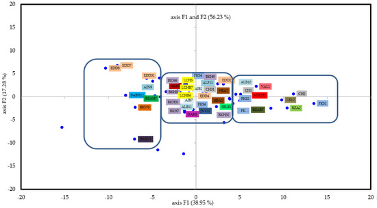 The PCA grouping together all varieties with the exception of “Taferyalt” (Figure 9) showed the existence of three categories depending on the variation of distances and angles. Category 1 constitutes the pole of the positive side of axis F1, which groups LBY (100%), VAL (100%), MATCH (100%), BZAB (100%), then CH (75%), FKS (60%), ALB (50%), and BZA (50%); this category is distinguished by large corner sheets. Category 2 constitutes the intermediate pole which includes HBA (100%), SBLB (100%), BKH (100%), ALF (100%), JNY (100%), DAW (100%), AIB (100%), LCH (100%), ALK (100%), FKS (40%), BZA (50%), ALB (50%), EDD (40%) and CH (25%); this category is distinguished by medium sized corner sheets. Category 3 constitutes the pole of the negative side of axis F1 which includes AIN (100%), BABH (100%), BZAH (100%), BKW (100%), HMR (100%), and EDD (60%); this category is distinguished by sheets of angles of small size.