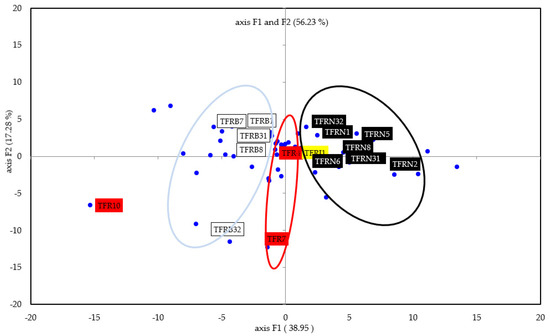 Regarding the second projection of the ACP with the “Taferyalet” grape varieties (Figure 10), we also made a distinction between three categories: Category 1 constitutes the pole of the positive side of axis F1, by grouping TFRN (100%) and TFRJ (100%); Category 2 constitutes the intermediate division regrouping TFR (100%); and Category 3 constitutes the pole of the negative side of axis F1, comprising TFRB (100%).