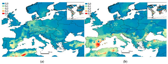 Potential (probabilistic) model of P. reticulata expansion built in the Maxent program based on the CliMond (a—1975 (1970–2000); b—2090 (2081–2100)) climatic data and GBIF data (2019). Areas of the highest habitat suitability (>0.3–0.5) are colored in red, and areas of the lowest (<0.1) are colored in blue.