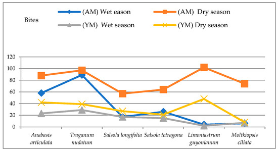 The results obtained (Figure 1) showed that for AM, the number of bite counts ranged from 4 to 89 in the wet season and from 57 to 102 in the dry season. The bite weight ranged from 0.76 g for Anabasis articulate in the dry season to 3.77 g recorded for Traganum nudatum in the wet season. For YM, the number of bite counts in the wet season was 7 to 29 and 8 to 48 in the dry season, respectively. The bite weights ranged from 0.57 g for Anabasis articulata during the wet season and 1.61 g measured for Traganum nudatum in the dry season. Overall, there is a significant difference (p < 0.05) in the average number of bites between seasons, with the dry season having a higher average number of bites than the wet season (33.33 ± 3.572 and 15.50 ± 9.955, respectively) for both (AM) and (AM) (80.33 ± 18.206 and 30.83 ± 14.959, respectively). The preferred species by male camels display a variation in the number of bites (p < 0.05); it is obvious that, during the dry season, Limoniastrum guyonianum, which is neglected during the wet season, is preferred. According to Ref. [5], this variability can be justified by the smell of this species during winter; it is the sense of smell that guides the animal in its choice more than the taste and view, while Traganum nudatum in both seasons remains very grazed. The total number of bites is inversely proportional to the bite’s weight [6]. The number of bites exhibits a significant difference between AM and YM (p < 0.05). Regarding the amount of dry matter intake (DMI) (Figure 2), for AM the highest quantity during the wet season is recorded for Traganum nudatum 2.01 kg DM, but Limoniastrum guyonianum recorded the highest amount with 1.1 kg MS during the dry season. For (YM), Traganum nudatum remains the highest daily intake of dry matter recorded in the wet and dry seasons, 0.28 and 0.36 kg DM, respectively. The study demonstrated a difference in the intake of dry matter between seasons (p < 0.05); this result is confirmed by Ref. [7]. Plant intake depends on their feeding behavior.