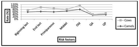 The prevalence rate (CMT > 1) is around 45% (47/104) for the cattle studied and 15% (62/416) for their quarters. In addition, the study carried out in camels yielded prevalence rates of 67% (38/57) for camels and 35% (76/216) for teats, respectively, i.e., an increase of 130% for teats and 50% for animals; Ref. [5] reports that camels are as susceptible to mastitis as other species. The differences between rates were not significant at p < 0.05, neither for animals nor quarters (Chi 2= 53.24 and 71.41) (Figure 1).
