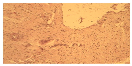 During the period between the fifth and the seventh day of the postpartum one observes a epithelium is more intact than that of the surface, and it is darker. The chorion is loose and characterized separately by less important vascularization. The number of uterine glands is a few or they are absent (Figure 2). They have small circular sizes and are scattered in the chorion.