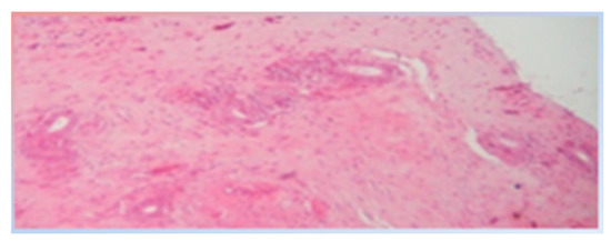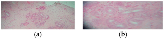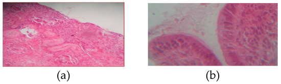 At the highest magnification (40) (Figure 6b), the epithelium appears to be simple and cylindrical. In light of the histological results of the endometrium, it appears that uterine involution in camels completes on the 21st postpartum day. These results agree with those in Ref. [7], which reports a duration of 40 days. We also used the method of transrectal palpation. Our results are in agreement with those declared by the authors of Refs. [4,8], who reported a duration from 15 to 28 days. The uterine lining is completely restored from the 18th postpartum day.