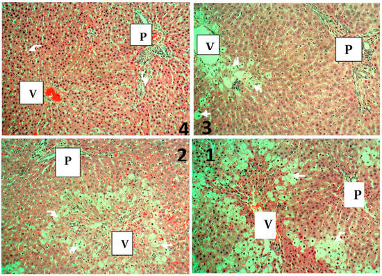 Liver sections of rats in groups 4 (normal), 3 (mild degeneration), 2 (mild necrosis), and 1 (marked degeneration). P represents the portal triads of the hepatic vein, hepatic artery, and bile ducts. V is the central vein. Arrows point to the hepatic lobules.