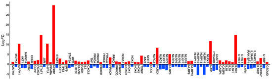 Visualization of the microarray data depicting the gene expression profile associated with NET formation. The microarray assay was performed using human neutrophils (5 × 106) derived from three different donors (three individuals) stimulated with RPMI (control) or Cr-LAAO (50 μg/mL) for 1 h at 37 °C in an atmosphere containing 5% CO2. Subsequently, RNA was extracted, and treated for cDNA hybridization on a microchip. A total of 22,000 genes were analyzed, and 83 genes that participate in NET formation, inflammasomes, and NADPH oxidase complex were selected. The genes’ relative expression, obtained in the microarray assay by comparing Cr-LAAO-stimulated cells with negative control-stimulated (RPMI) human neutrophils, were represented by the fold change, demonstrating the gene upregulation (red) and downregulation (blue) fold change bar plot.