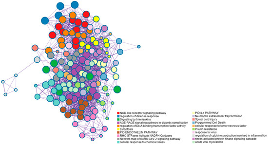 Network of enriched terms colored by cluster-ID. Based on the data obtained from the microarray assay and gene selection for the study, nodes sharing the same cluster-ID are typically located in close proximity to each other.