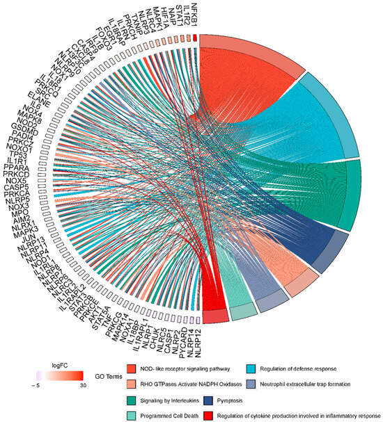 Correlation of the gene expression profile of NETs with other signaling pathways. Enriched items from pathways related to the formation of NETs, inflammasomes, and the NADPH oxidase complex were compared with pathways related to the inflammatory process and plotted in a chord diagram to visualize the enrichment result.