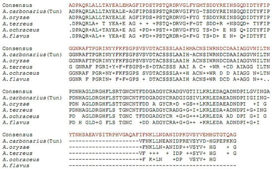 Alignment of the deduced amino acid sequences “AC Pks” of A. carbonarius (Tun) isolated from Tunisian grapes with the corresponding PKSs regions of A. oryzae (Accession No. AP007162), A. ochraceus (Accession No. AY272043), A. terreus (Accession No. CAB44699), and A. flavus (Accession No. AAS90022).