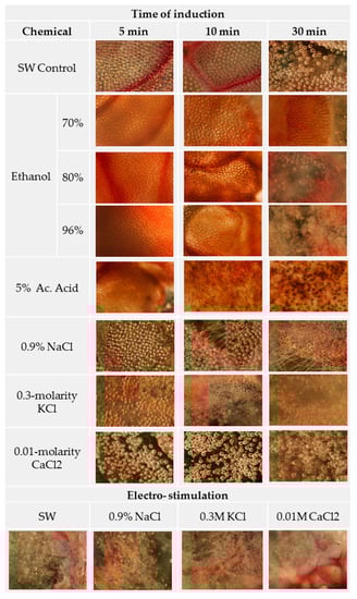 Little or no nematocyst discharge was observed in seawater (SW), which was used in this study as a control probe. Exposure to the acetic acid solution induced a sparse but significant discharge of nematocysts 15 min after exposure. Surprisingly, the induction using 70% ethanol did not lead to significant differences in relation to the SW, but the concentrated solutions (80% and 96% ethanol) induced significant discharges (Figure 1, Table 1), which increased with exposure time and concentration. Tentacles exposed to NaCl and KCl solutions did not discharge nematocysts for up to 15 min of exposure, but after that point, substantial discharges were observed, reaching values greater than 90%. In contrast, the CaCl2 solution did not show significant differences in relation to the SW. A massive number of discharged nematocysts were observed when the tentacles were electrically stimulated using a single 3-s pulse. Notably, the electrical stimulation of tentacles immersed in Ca2+ solution induced significantly fewer discharges (p = 0.001) than in SW, thus suggesting that Ca2+ had an inhibitory effect on nematocyst discharge.