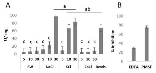 Proteolytic activity of P. physalis venom: (A) proteolytic activity of venom obtained from the nematocysts challenged with different chemicals (SW, NaCl, KCl and CaCl) at different induction times (5, 10 and 30 min) and venom obtained via tissue homogenization (beads); (B) inhibitory activity caused by EDTA and PMSF on venom recovered from nematocysts challenged with NaCl. Letters indicate significant differences among groups at the 0.05 level (ANOVA test).