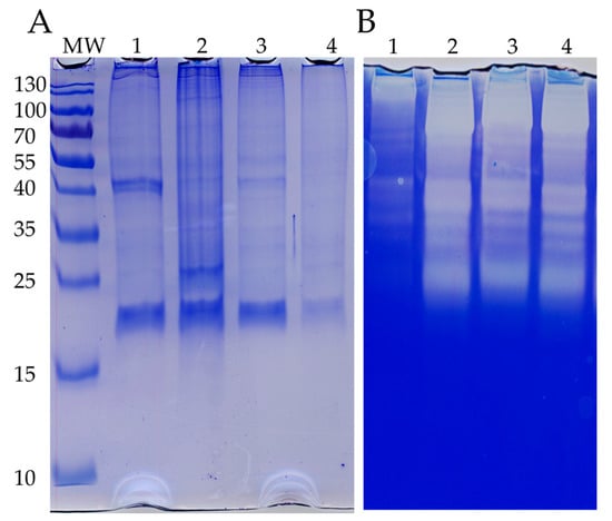 Protein and enzymatic profiles of venom derived from P. physalis: (A) SDS-PAGE pattern; (B) gelatin zymogram. Venom samples obtained from extraction via the following methods: 1, ethanol; 2, homogenization; 3, 0.9% NaCl; 4, 0.3-molarity KCl.
