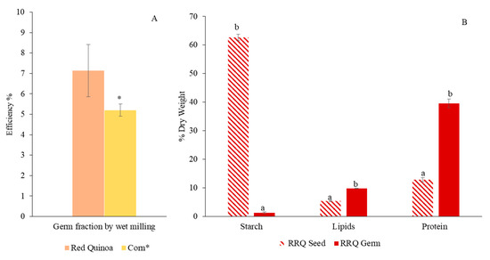 (A). Extraction efficiency of the red quinoa germ fraction compared to corn germ fraction obtained by wet milling. * Values retrieved from “A 100-g Laboratory Corn Wet-Milling Procedure” by Eckhoff et al. [10]. (B). Red quinoa proximate composition (striped bars) compared to the proximate composition of germ fraction (filled bars). RRQ: Red Royal quinoa; Mean ± SD, n = 3. Bars of the same parameter followed by the same letter indicate that there are no statistically significant differences at a 95% confidence level.