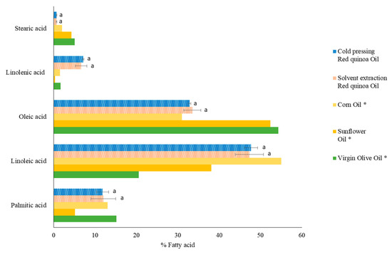 Fatty acid profile of quinoa oil of the germ fraction extracted by cold pressing and solvent extraction compared to the fatty acid profile of the most frequently used edible oils. Mean ± SD, n = 3. Bars of the same parameter followed by the same letter indicate that there are no statistically significant differences at a 95% confidence level. * Values retrieved from BOE-A-1983-5543 [11].