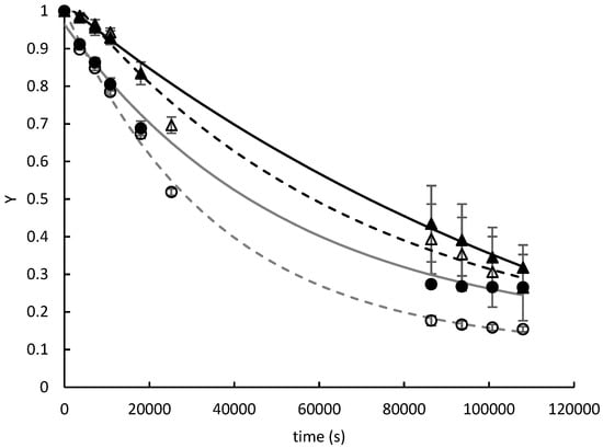 Evolution of the driving force (Y) versus drying time (s) of moringa leaves: the logarithmic model (continuous lines, 4-year-old moringa; dashed lines, 1-year-old moringa; black, field dryer; grey, tray dryer) and experimental points (triangles, field dryer; circles, tray dryer; filled symbols, 4-year-old moringa; empty symbols, 1-year-old moringa). Y, the driving force.