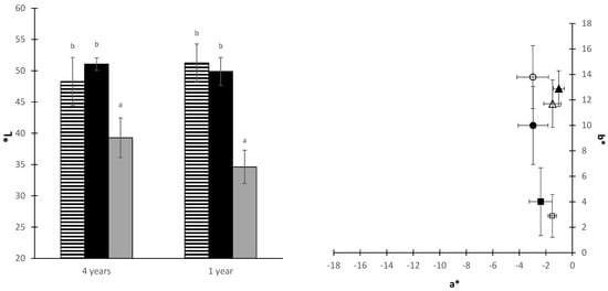 The luminosity (L*) (bars with horizontal lines, tray dryer; black bars, field dryer; grey bars, fresh leaves) and the location in the chromatic diagram (b* vs. a*) of the moringa dried leaves in this study (square, fresh leaves; triangles, field dryer; circles, tray dryer; filled symbols, 4-year-old moringa; empty symbols, 1-year-old moringa). Identical letters indicate homogeneous groups obtained in the ANOVA with n.s: 95%.
