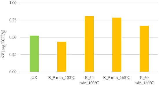 Figure 1 shows the AV results for roasted and unroasted walnut oils. The use of different roasting conditions affects the AV of oil. The lowest AV can be observed when using a lower temperature and a shorter roasting time. However, the highest AV was obtained after 9 min of roasting at 160 °C and after 60 min of roasting at 100 °C. Similar observations were reported by Gao et al. [5], who examined the properties of oil obtained from walnuts by treating them with different temperatures at different time intervals. Their research shows a relationship in which the AV increases with increasing temperature and time of roasting. Therefore, generally increasing the roasting temperature and time, the AV of oils increases, but it can also be stated that individual temperatures and times have certain individual optima at which the AV reaches the lowest values for a given combination of time and temperature. Exceeding this optimal level is associated with an increase in the AV.