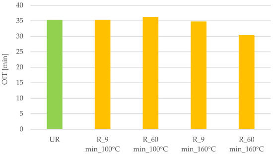 Taking into account the obtained results regarding the peroxide value (PV), which is an indicator of the primary oxidation products, as well as the oxidation induction time (OIT) determined using differential pressure scanning calorimetry, it can be concluded that roasting does not affect the oxidative stability of the oil. Both samples before and after roasting are characterized by a similar PV as well as a similar OIT (Figure 2). The peroxide value values for each analyzed oil were below 0.01 mEq peroxide/kg. Comparing this oxidation stability with other oils, it can be concluded that walnut oil is characterized by a short OIT. This may be due to the high content of unsaturated fatty acids in its composition. Oxidative stability refers to the resistance of fats to undergoing oxidative reactions that can lead to rancidity and the formation of harmful compounds. It is a critical quality parameter for both dietary fats and fats used in various industrial applications. Oxidative stability is influenced by several factors, including the chemical structure of the fatty acids, the presence of antioxidants, and the conditions under which the fats are stored and used.
