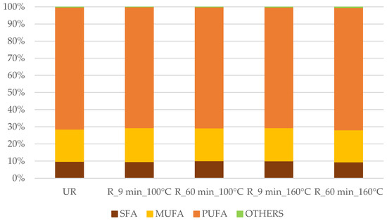 Walnut oil consists mainly of triacylglycerols, which constitute 83–95% of the total fraction of this oil. The triacylglycerols in question consist of tri-unsaturated and asymmetric di-unsaturated glycerides. As mentioned earlier, the fatty acids in walnut oil are mostly unsaturated. In the case of walnut oil, the largest amounts include linoleic acid and oleic acid. The 2-position of triacylglycerol is dominated by linoleic acid [6]. The only monounsaturated fatty acid found in walnut oil is oleic acid [14]. The roasting process did not affect the fatty acid composition of the analyzed oils.