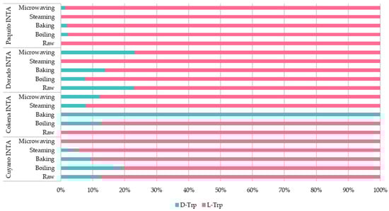 Concerning Tyr and Trp, Table S5 shows that L-Tyr was the most abundant of the AAs, while D-Tyr was not detected in any of the cultivars studied. Moreover, both L enantiomers (Tyr and Trp) were present at a ratio of 80–90%; meanwhile, D-Trp constituted approximately 2% of the total AAs level (Figure 1). The ANOVA analysis showed significant differences for the levels of enantiomers studied between cultivars and cooking methods. The cultivar × cooking treatments interaction was significant at p < 0.05 (Table S6). When boiling pumpkin, there were significant losses in most amino acids (L-AAs), except for L-Tyr in the Paquito INTA variety, which increased; nevertheless, D-Trp levels exhibited a rise in all cases except for the Dorado INTA cultivar, likely due to the water-based cooking process [,]. Steaming generally increased L-AAs levels, except for L-Tyr and L-Trp in Dorado INTA and Paquito INTA, respectively, with significant losses in D-Trp in some varieties. Microwave cooking retained or increased the amino acid content, except in the Cuyano INTA variety, aligning with findings from Ito et al. [] (Figure 1). In a complex matrix like food, pinpointing the specific cause for alterations in individual amino acids becomes challenging []. The genotype influences the expression of genes associated with the biosynthesis of compounds, while cooking methods impact the extractability and stability of compounds [].