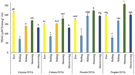 In terms of nutritional levels, the antioxidant activity of fruits and vegetables represents a very important characteristic of quality. Antioxidant activity was assessed by the evaluation of the free radical scavenging ability (DPPH test). As shown in Figure 2, all of the four pumpkin cultivars exhibited appreciable scavenging properties against DPPH radicals. The antioxidant activity of fresh pumpkin ranged from 149.59 ± 4.10 to 213.20 ± 5.59 µM Trolox g−1 fw in Cokena INTA and Cuyano INTA, respectively. The free radical scavenging activity exhibited by cooked pumpkins was found to be in the range of 69.93 to 256.44 µM Trolox g−1 fw. It was evident that the steamed pumpkin flesh was the most powerful antioxidant, as its radical scavenging activities were significantly different from those of any of the other kinds of cooked pumpkin flesh. Meanwhile, the boiled samples exhibited the lowest radical scavenging activity; this could be attributed to the heat-degraded bioactive compounds having leached into the cooking medium.