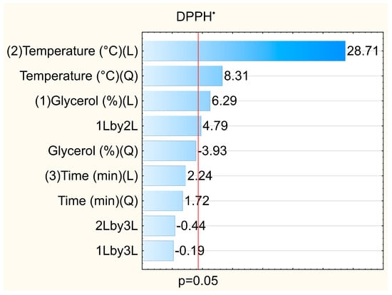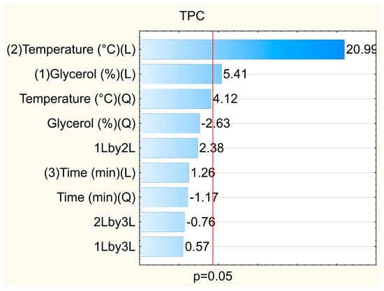 The Pareto chart presented in Figure 1 and Figure 2 indicates that the TPC and antioxidant capacity of the extracts were influenced mostly by temperature and glycerol concentration in the extraction solution, with positive linear effects for both independent variables. For the temperature variable, the quadratic effect was also significant, meaning that high temperatures can reduce the antioxidant potential of the extracts, possibly due to degradation or changes in the structure of the extracted compounds. Also, it is possible to observe that the variable time did not influence the evaluated responses.