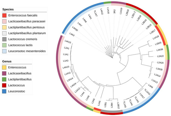 Phylogenetic tree of the forty-six 16S ribosomal sequences of lactic acid bacteria isolated from raw goat’s cheese. The tree shows the species identified for each sample (inner circle) and the genus of each sample (outer circle).
