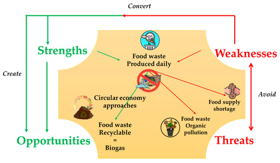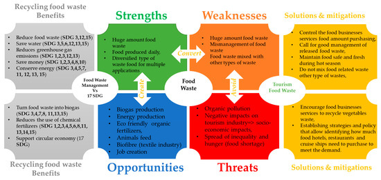 Food waste presents major socio-economic and environmental issues for countries; the adoption of circular economy approaches remains the only solution that may help mitigate the growing amount of food waste. Countries popular for tourism activities with significant numbers of yearly visitors are likely to be the most affected by waste, which may affect them at different levels. The mismanagement of food waste and its continuous growth may affect the tourism sector itself and discourage tourists from spending their vacations in a polluted country. Thus, the mismanagement of waste is a weakness that can be converted into a strength by creating opportunities and avoiding possible threats (Figure 1).