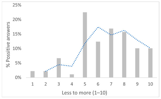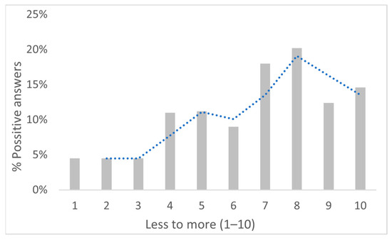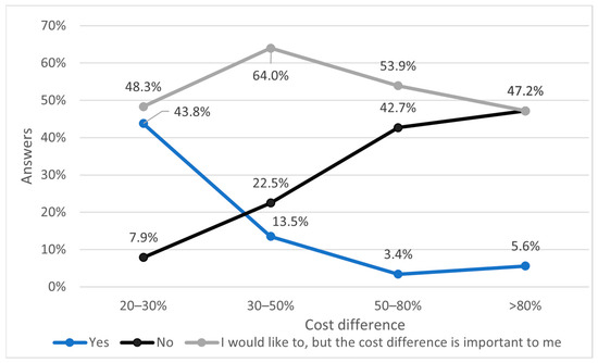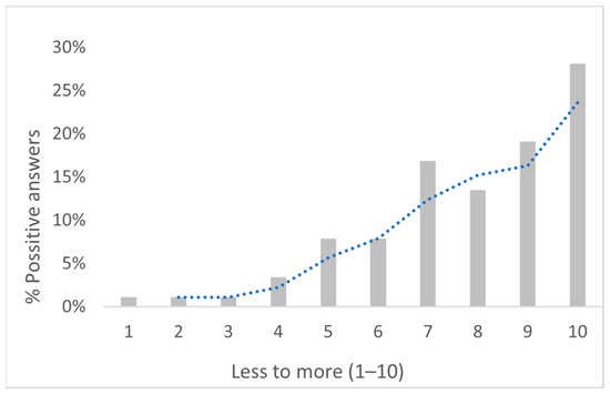 The answers produced quite interesting results. Most participants answered questions about their awareness of circular economy and bioeconomy positively (on average, 84.96%) (Table 2). Furthermore, results showed that participants (on average, 50%) did not think that the information they receive from local authorities (such as schools, media, etc.) is sufficient (Table 2). Some 55.1% of participants agree that the shift towards sustainability is crucial for our society and must be implemented immediately (Table 2). Figure 1, Figure 2, Figure 3, Figure 4, Figure 5 and Figure 6 show the results of the questions which was included in section B (Table 1). Finally, 43.8% (the highest score) of participants would be willing to pay 20–30% more to purchase a product that is entirely (or partly) produced within the circular economy than another product in the same category; an average of 53.4% of them would like to pay more, but cutting costs is important to them (Figure 7). In conclusion, this study shows that most participants are aware of biotechnological applications for sustainability, etc., and would like to know more about these applications.
