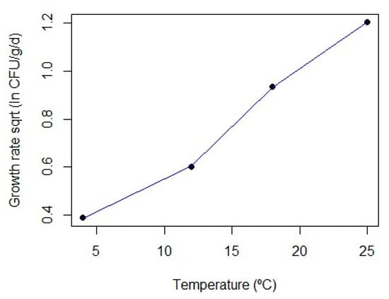 Table 1 summarizes the mean maximum growth rates (µmax), maximum populations (Ymax) and population increases (∆Y) obtained for the different temperature conditions. The values of µmax steadily increased with temperature from 0.345 ± 0.162 to 3.338 ± 0.907 ln CFU/g/d for 4 and 25 °C, respectively. Particularly, the slope of the relationship between the LAB µmax and temperature increased with the highest temperatures (Figure 1). The Ymax values were also higher as the storage temperature increased. However, the ∆Y did not display significant differences (p > 0.05) between the averaged values obtained for temperatures above 12 °C. LAB growth obtained in this sort of cheese was substantially higher than in others such as raw sheep milk cured cheeses, where µmax was 0.081 and 0.136 ln CFU/g/d at 12 and 22 °C, respectively [].
