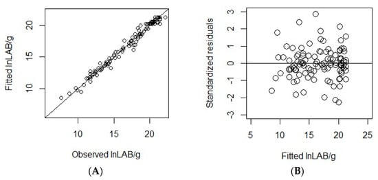 Omnibus model’s goodness-of-fit, including the coefficient of correlation of the observed values versus the fitted ln LAB/g (A) and the coefficient of correlation of the fitted values versus the model’s residuals (B).