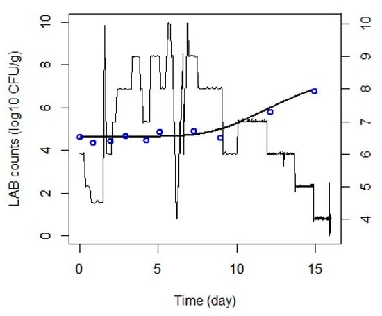 Characterizing LAB behavior in the product through the use of predictive microbiology models is fundamental for a better understanding of the impact they may have on the final product’s quality. Typically, a primary model is fitted to growth data obtained over time at constant temperatures. The estimated parameters may be applied to a secondary model fitting that describes the effect of environmental conditions on the growth rate []. In the case of one-step or omnibus modeling, both fitting stages are performed at the same time under a mixed-effects nonlinear regression involving all the experimental conditions and the residual errors linked to them. This is an advantageous approach since it permits the variability not explained by the environmental conditions to be accommodated by the model parameters [].