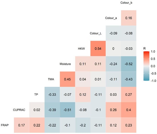 To further investigate the inter-relationships that may exist between the bioactive phytochemical constituents and the physical characteristics of the seed, Pearson R linear correlation analysis was performed. The results are summarised in the correlogram presented in Figure 1. Significant correlations were observed between TPC and FRAP but not between TPC and CUPRAC or FRAP and CUPRAC. The CUPRAC was positively correlated with the b* colour but negatively correlated with moisture content.
