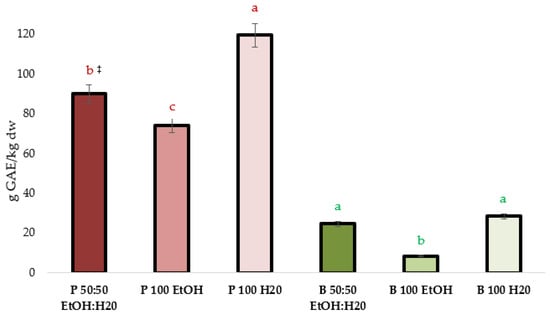 Total phenolic compounds (g gallic acid equivalents/kg dw) derived through Folin assay (garnet-coloured colums: pomegranate samples; greenish columns: broccoli samples). ‡ Columns with a different letter and the same color were significantly different (p < 0.05).