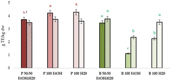 The effect of the solvent on the TAC via DPPH and ABTS assay was different in pomegranate and broccoli by-product extracts obtained using MWAE. In pomegranate extracts, ethanolic and aquose extracts presented the highest DPPH assay values, followed by 50:50 ethanol:water solvent. No significant differences were observed among solvents in ABTS data in pomegranate peel. On the other hand, the highest DPPH values were observed in the extracts obtained via 50:50 ethanol:water solvent, followed by aquose solvent. Brocoli by-product extracts using 50:50 ethanol:water and 100% water solvent presented the highest ABTS values (Figure 2).