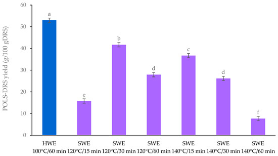 POLS-DRS yields obtained under various conditions are illustrated in Figure 1. The HWE generated the highest POLS-DRS yield of 51.01 g/100 g DRS because the extracted polysaccharides were water-soluble starch [8]. At a temperature of 120 °C, the maximum POLS-DRS yield of 41.71 g/100 g DRS was produced at 30 min, whereas the SWE conducted at 140 °C gave a maximum POLS-DRS yield of 36.72 g/100 g DRS at 15 min. At an escalated temperature, subcritical water partially hydrolyzed polysaccharides to oligosaccharides [9]. Hence, temperature and time are crucial parameters for SWE.
