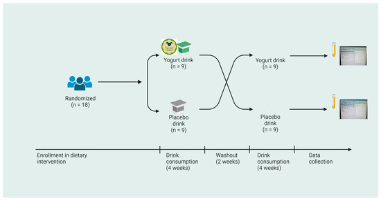 The dietary intervention was designed as a randomized double-blind crossover study, with the control group provided a placebo drink containing significantly lower amounts of polar lipids (n = 18), produced as described in Section 2.2. Two study phases were organized with equally divided groups, and each phase of trial was conducted for 28 days. Figure 1 is a schematic representation of the study design.