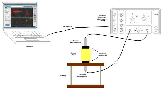 In this configuration system, a laptop was connected via a USB-type connection to the echoscope of an ultrasonic tomograph (GAMPT®, Merseburg, Germany 2016). From this, two 2 cm diameter ultrasonic sensors at 2 MHz were connected, with a transmitter–receiver configuration as shown in Figure 1. The excitation pulse was normal-incidence. The sampling rate was 100 MHz. Each of the cheese samples was placed on a support. Ultrasonic gel was used to match the impedance between the ultrasonic sensor and each of the cheese samples.