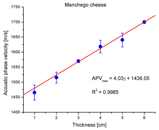 In Figure 2, Figure 3 and Figure 4, the graphs of the acoustic phase velocity in the different types of cheeses are shown. A linear fit was performed using the Origin 8.0 program (OriginLab®, Northampton, MA, USA), with a confidence level of 0.95.