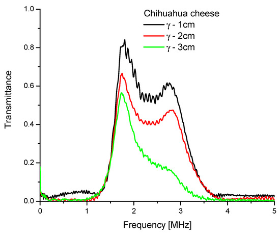 Acoustic transmittance as a function of the frequency of Chihuahua cheese.
