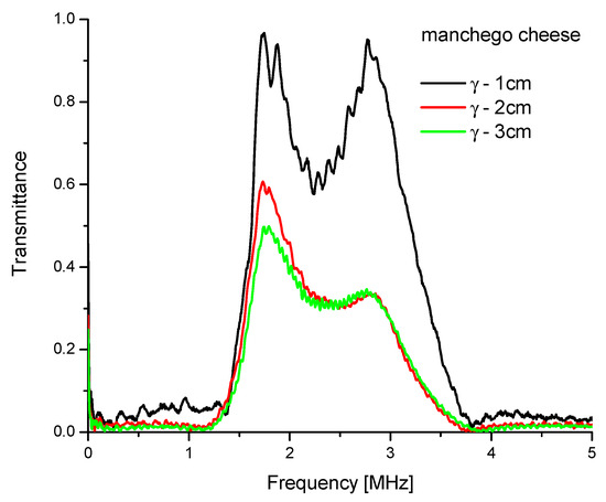 Acoustic transmittance as a function of the frequency of Manchego cheese.