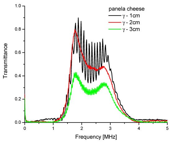 Acoustic transmittance as a function of the frequency of panela cheese.