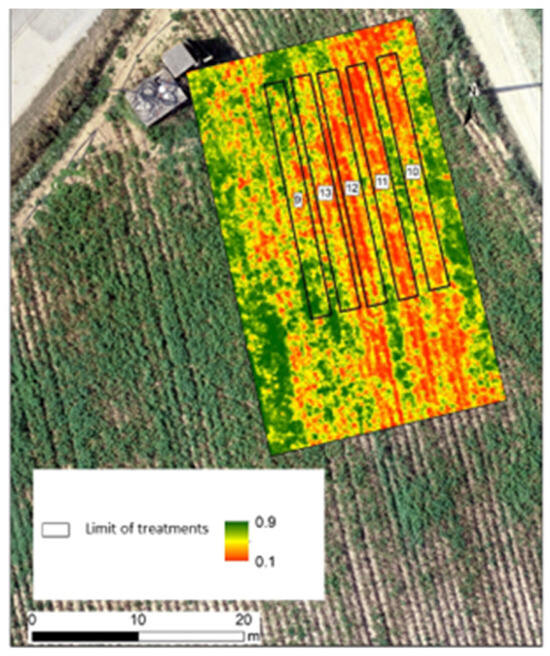 NDVI model were carried out on the Solanum tuberosum L. plants of the Agria variety six days after the sixth foliar application of Ca (Figure 1). As such, higher values are represented in green, while lower values are depicted in red.