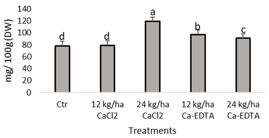 Calcium content (n = 4 ± EP) (mg/100 g, considering the dry weight) in tubers of Solanum tuberosum L. (Agria variety) at harvest. Different letters (a, b, c, and d) indicate significant differences between treatments.