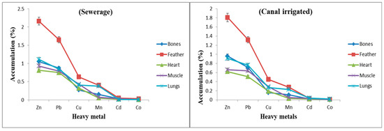 The results revealed that among all organs of these cattle egrets, maximum concentrations of the heavy metals Zn (2.16), Pb (1.65), Cu (0.63), Mn (0.4), Cd (0.05), and Co (0.03) were recorded in feathers, followed by lungs with Zn (1.11), Pb (0.84), Cu (0.41), Mn (0.38), Cd (0.01), and Co (0.01) heavy metals. An analysis of these cattle egrets’ bones revealed that they contained Zn (1.05), Pb (0.87), Cu (0.27), Mn (0.15), Cd (0.03), and Co (0.01). The overall trend of heavy metal accumulation in the body profile of cattle egrets collected from the sewerage area was Zn > Pb > Cu > Mn > Cd > Co (Figure 1).